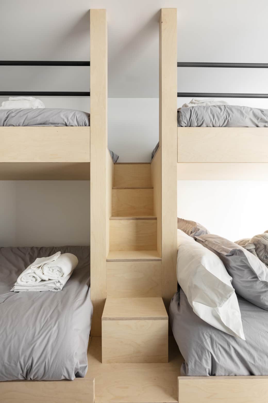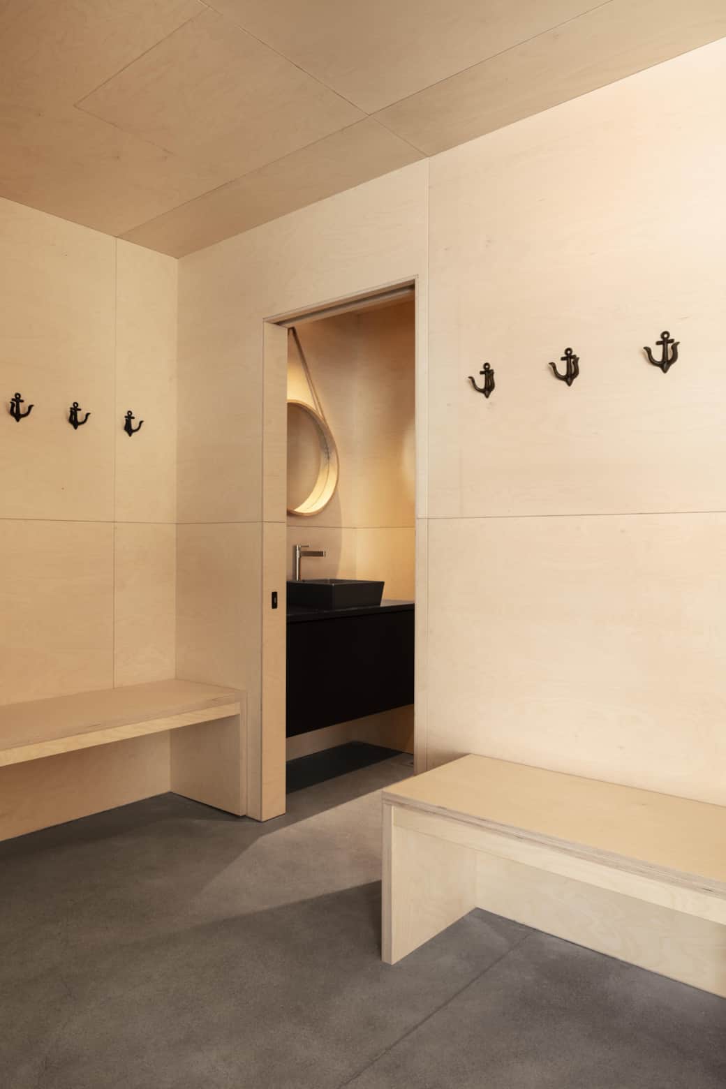 Le plafond cathédrale s’élève, reprenant la forme extérieure de la cabine. Une échelle de bateau mène à une cachette secrète dans les combles, un espace ludique qui émerveille les enfants et rappelle l’esprit maritime du lieu.