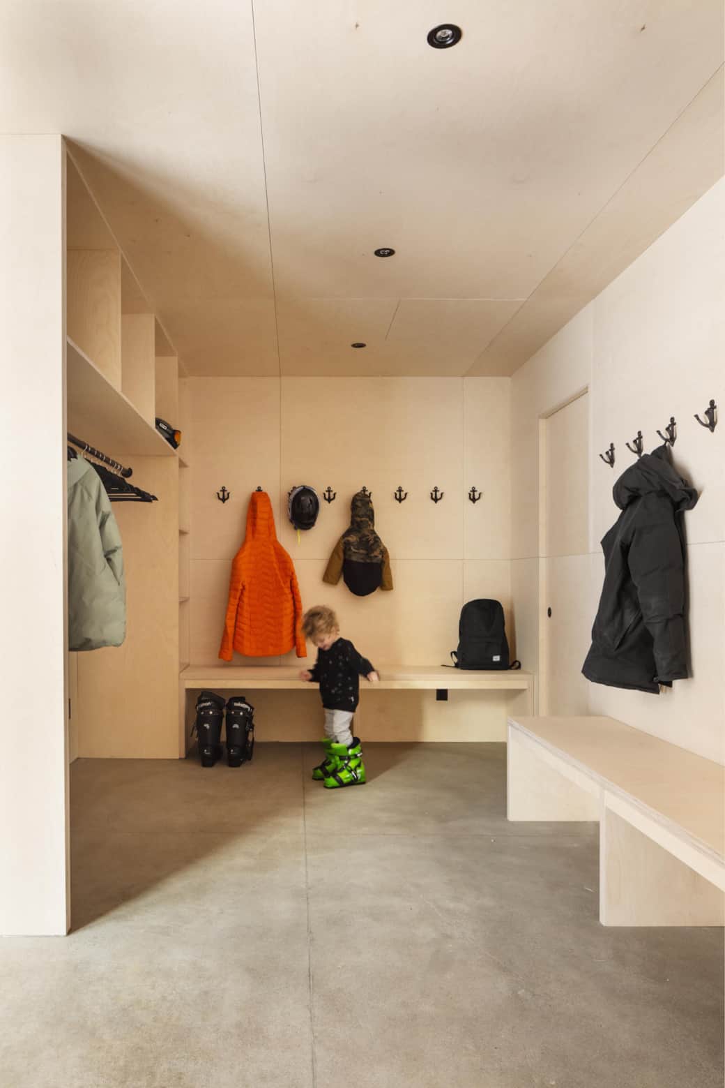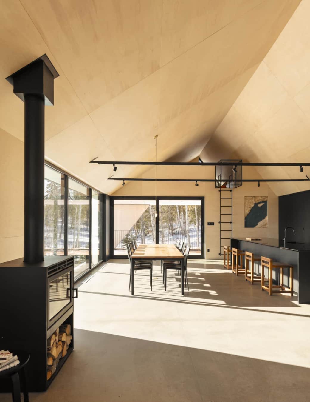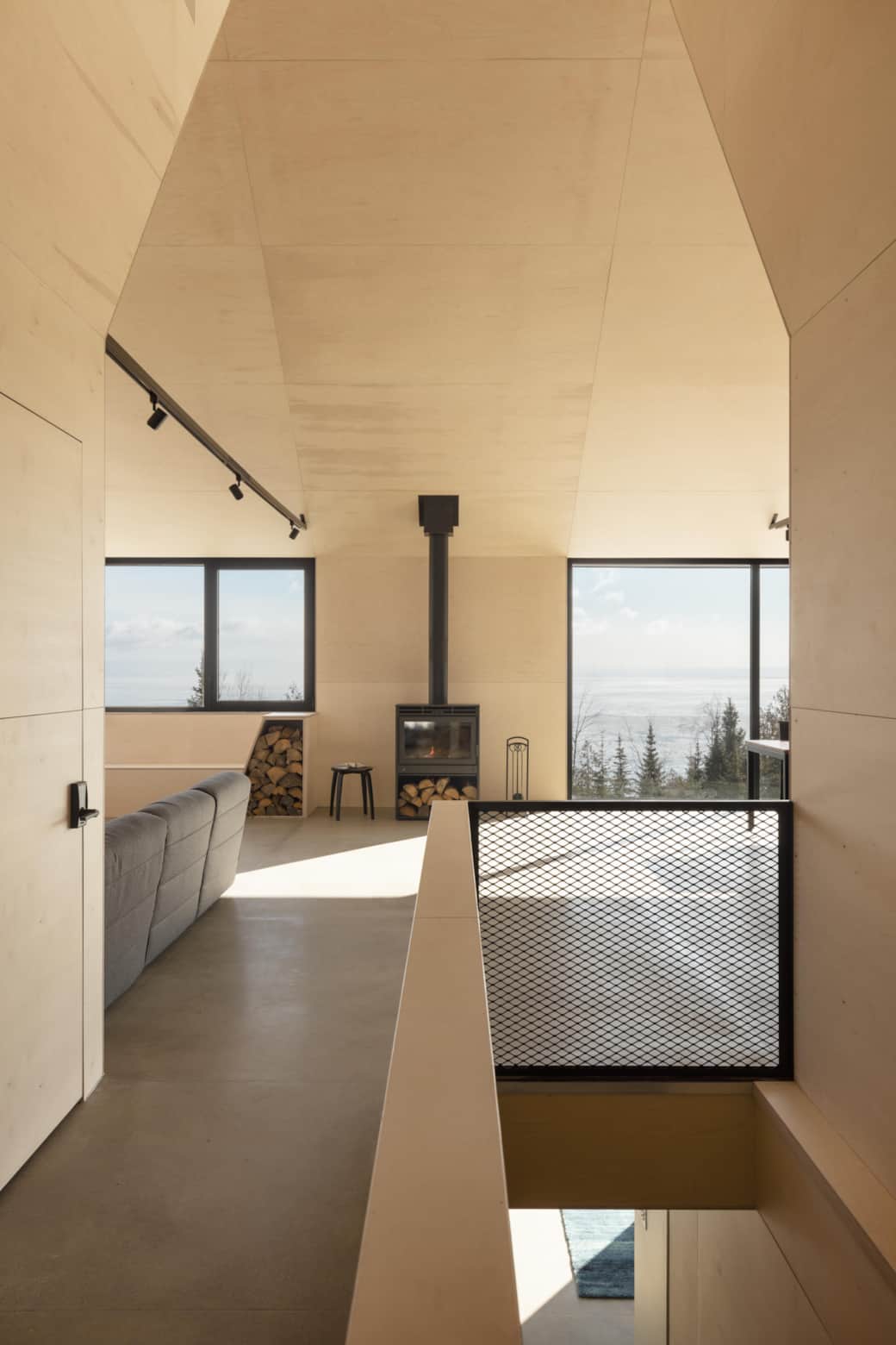 Les grands panneaux de contreplaqué russe habillent murs et plafond, et se prolongent jusque sous les replis du toit.